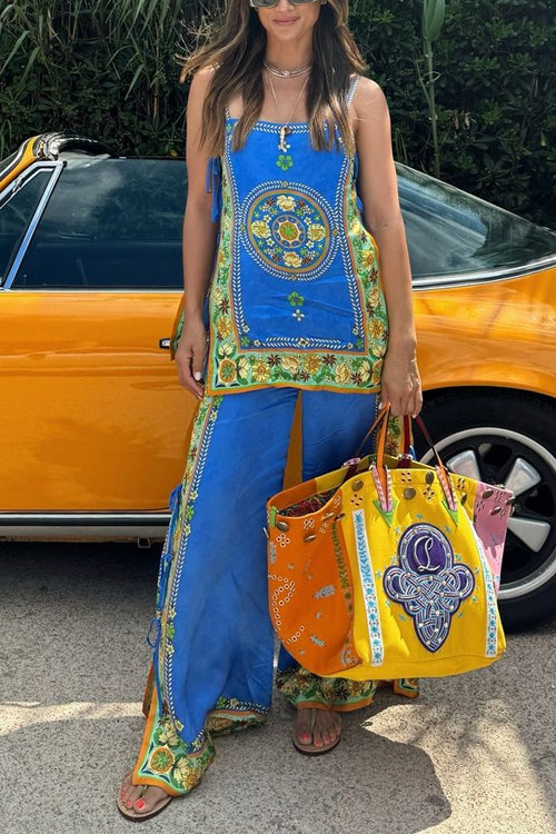 A lively, sophisticated set, perfect for the summer season. The top with adjustable straps and side ties pairs with palazzo pants featuring pockets and an elastic waistband for a comfortable yet striking look.
